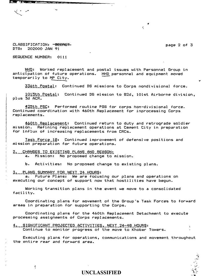 Document 3 f:/Week-08/BX000015/DUTY LOG 18 PER GP SITREPS G3 JAN 91/major significant activities summary 202000 jan 91:04109619191910