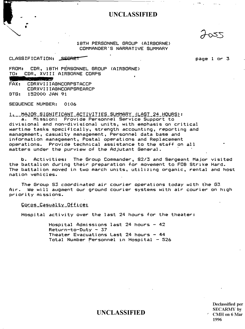 Document 3 f:/Week-08/BX000015/DUTY LOG 18 PER GP SITREPS G3 JAN 91/major significant activities summary 152000 jan 91:04109619191915