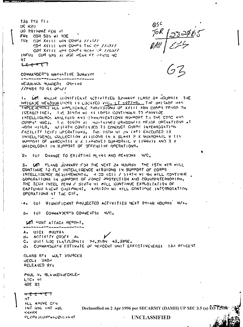 Document 1 f:/Week-08/BX000015/DUTY LOG 525 MI BDE SITREPS G3 FEB 91/commanders narrative summar:04109619191923