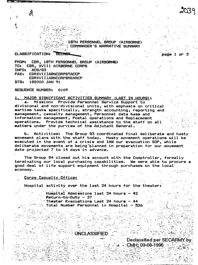 Document 3 f:/Week-08/BX000015/DUTY LOG 18 PER GP SITREPS G3 JAN 91/major significant activities summary 182000 jan 91:0410961919198