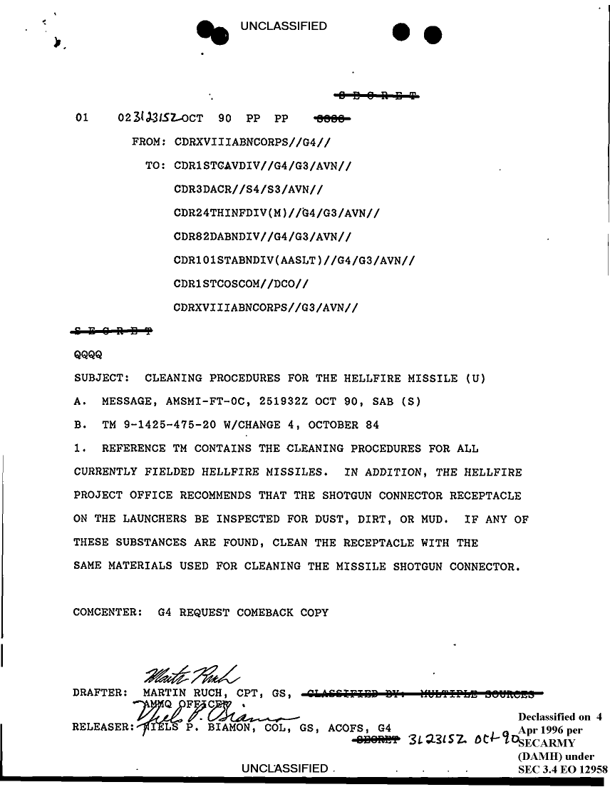 Document 2 f:/Week-12/BX000031/DUTY LOG REAR CP G3 1 NOV 90/cleaning procedures for the hellfire missile:0415961640006