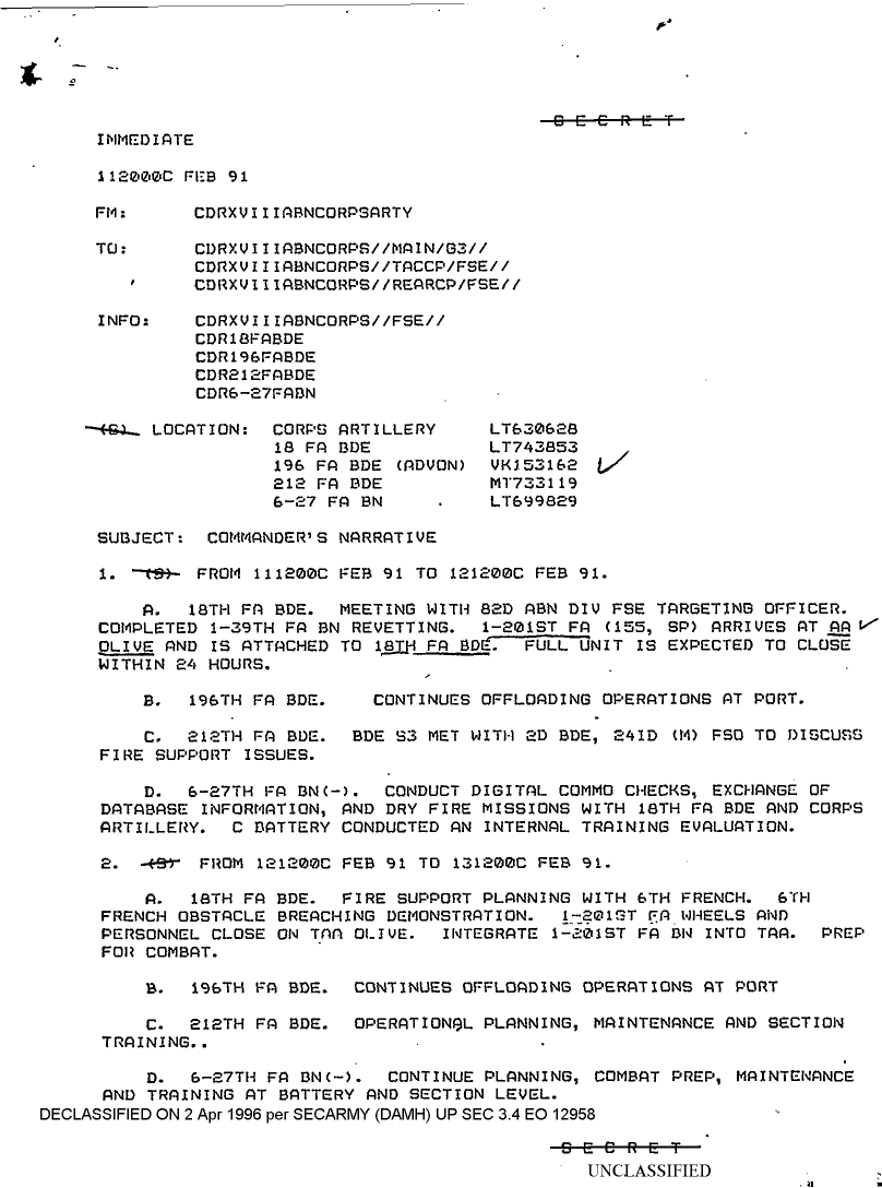 Document 2 f:/Week-08/BX000015/DUTY LOG 18 CORPS ARTY SITREPS G3 FEB 91/commander's narrative 11 feb 91:0503961332195