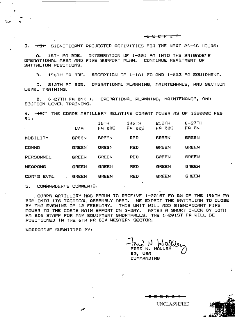 Document 2 f:/Week-08/BX000015/DUTY LOG 18 CORPS ARTY SITREPS G3 FEB 91/commander's narrative 11 feb 91:0503961332195