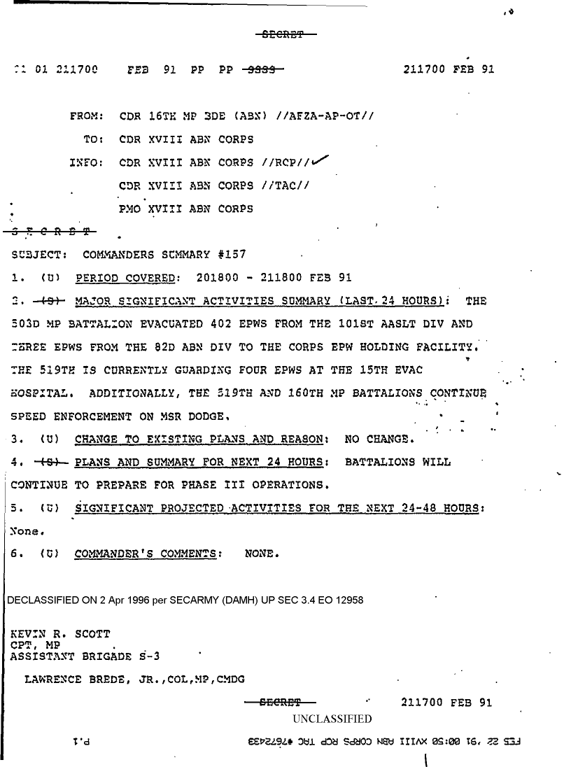 Document 1 f:/Week-08/BX000015/DUTY LOG 16 MP BDE SITREPS G3 FEB 91/comanders summary 157:0503961332199