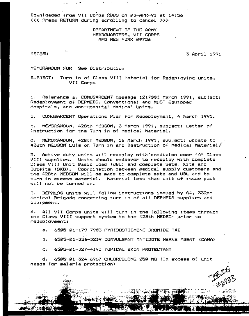 Document 2 f:/Week-24/BX000226/27 MAR LOG NUMBER 3924 - 3997 CLOSED 6 APR 91 271950 MAR - 071200 APR 91/memorandum turn in of class viii materiel for :07059613423839