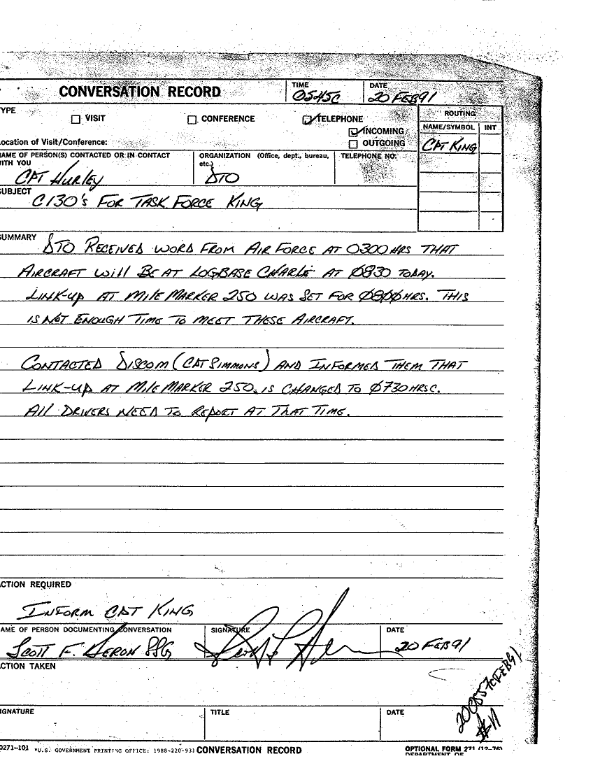 Subject = DAILY STAFF JOURNAL 20 FEB 91