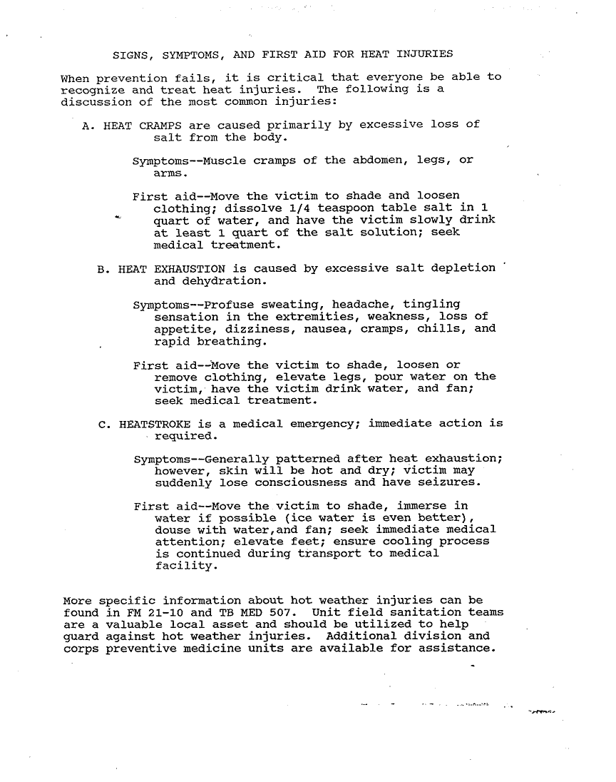Document 1 f:/Week-23/BX000205/PAMPHLET VU GRAPHS SLIDES OPS DESERT SHIELD SAFETY NOTES/signs systoms and first aid for heat injuries:07129615522510