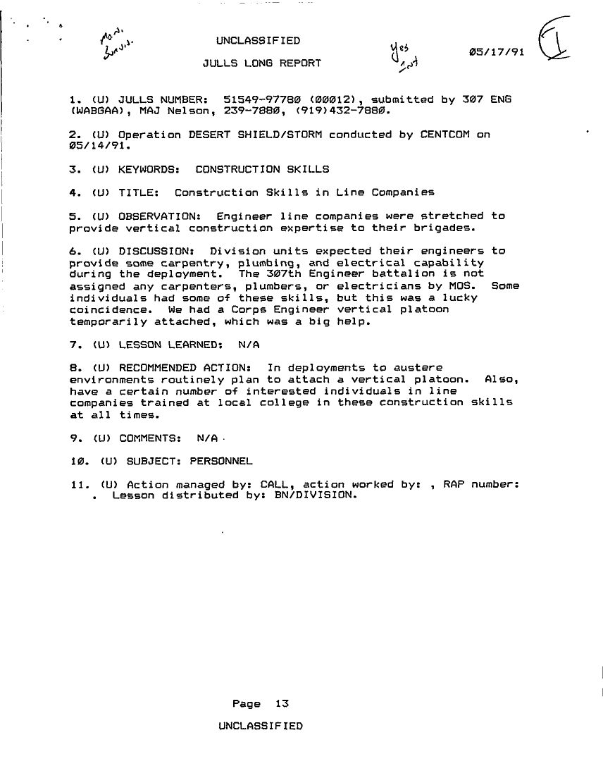 Folder Title = JULLS LONG REPORT 17 MAY 91 - 1