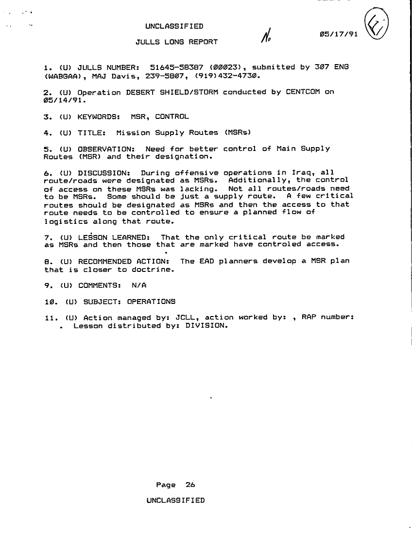 Folder Title = JULLS LONG REPORT 17 MAY 91 - 1