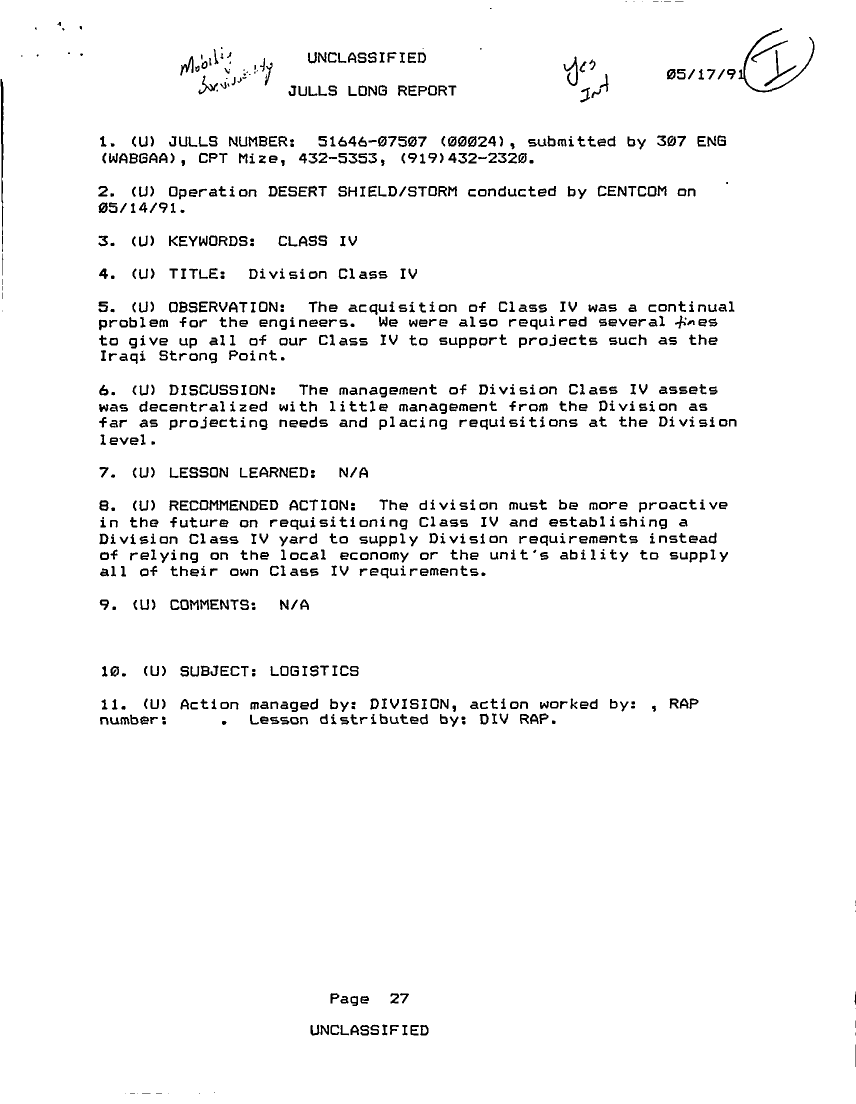 Folder Title = JULLS LONG REPORT 17 MAY 91 - 1