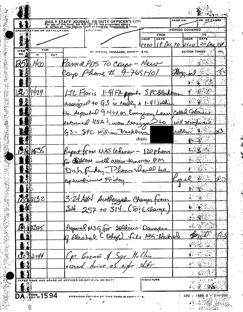 Document 180 f:/Week-22/BX001433/MESSAGE TRAFFIC LOGS-COMPLETED ACTIONS/daily staff journal duty log:07199610203890