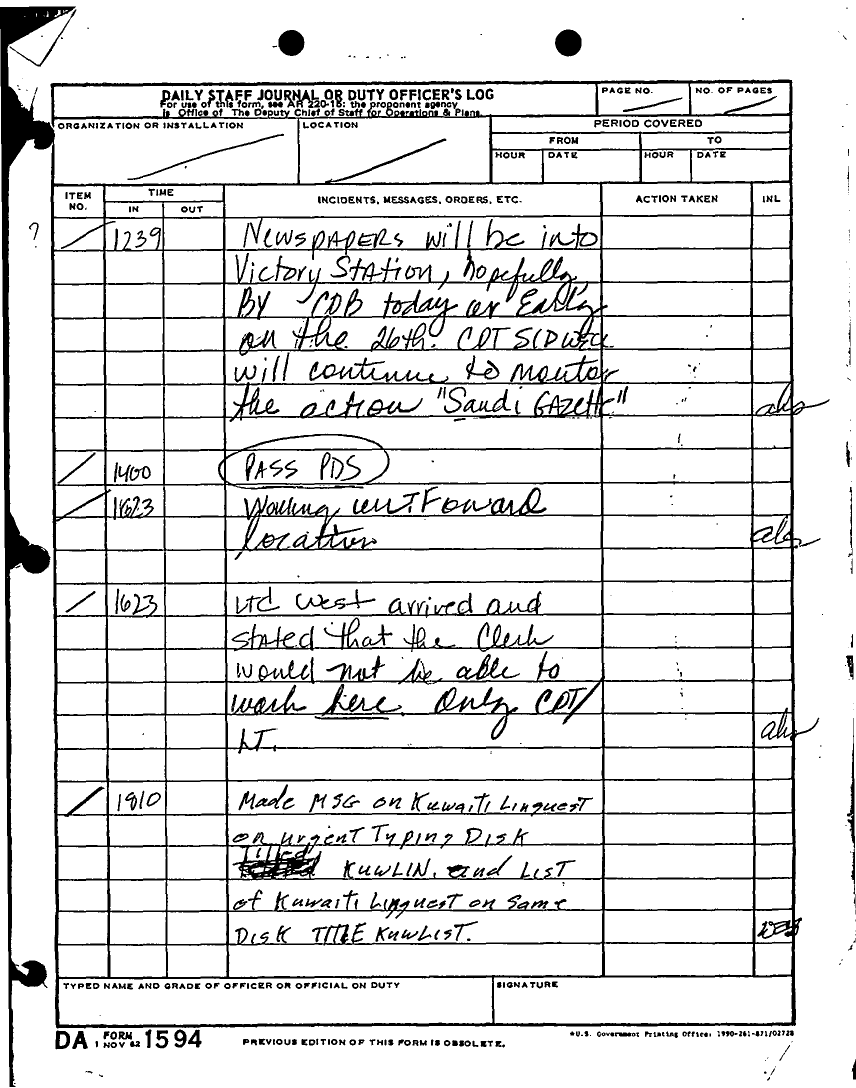 Document 180 f:/Week-22/BX001433/MESSAGE TRAFFIC LOGS-COMPLETED ACTIONS/daily staff journal duty log:07199610203890