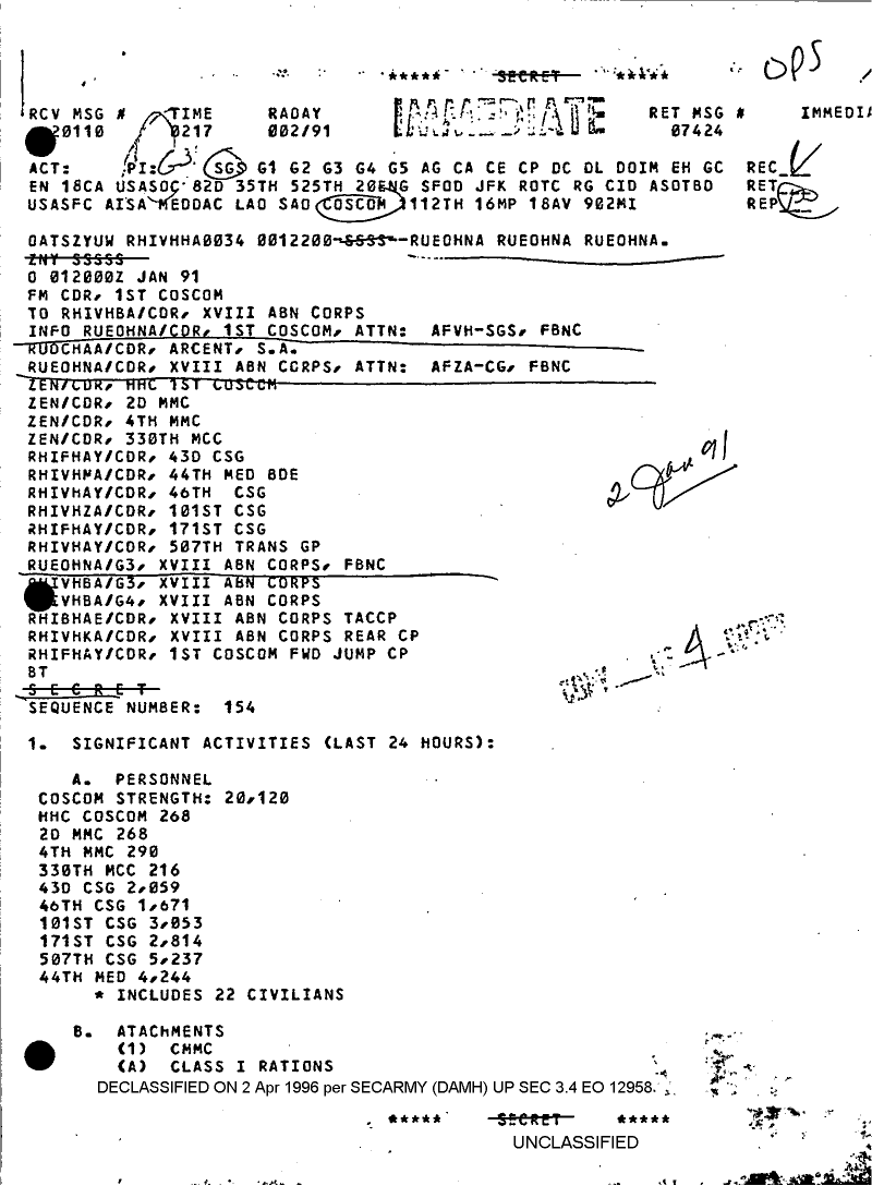 Document 4 f:/Week-08/BX000015/DUTY LOG 1 COSCOM SITREPS G3 JAN 91/significant activities:08099611160858