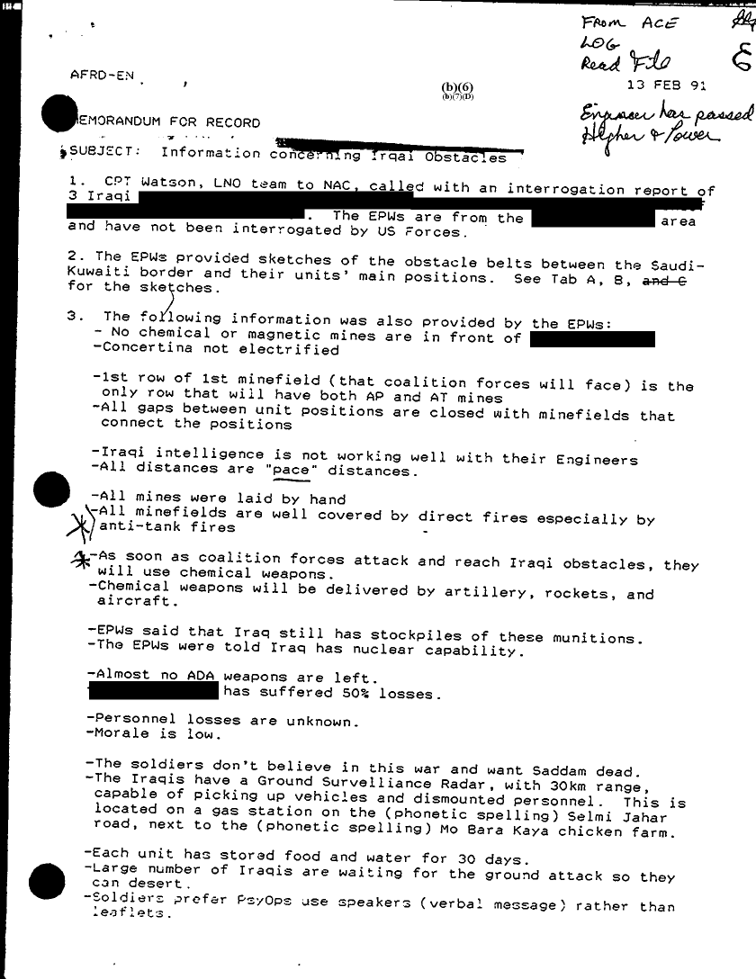 Document 4 f:/Week-28/BX000410/TACTICAL OPERATIONS CENTER LOGS - LUCKY TAC JOURNALS 11-14 FEB 91/information concerning iraqi obstacles 13 feb :08099611154131