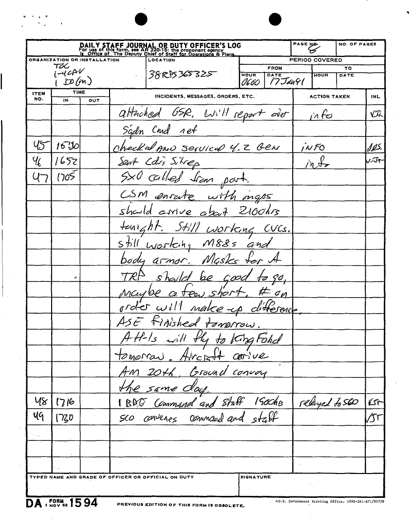 Folder Title = DAILY JOURNAL-STAFF JOURNAL AND TACTICAL OPERATIONS CENTER -TOC- LOGS DESERT STORM 17 JAN 91