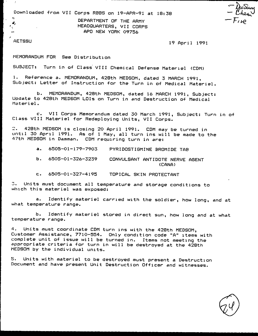 Subject = TURN IN OF CLASS VIII CHEMICAL DEFENSE MATERIEL