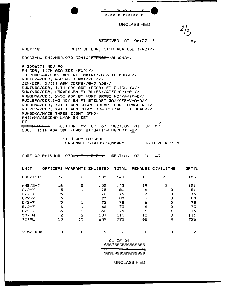 Document 11 f:/Week-29/BX000429/TACTICAL OPERATIONS CENTER LOGS - MSG FILE LOGS 23 NOV 90/11th ada bde situation report 87:08169613342730