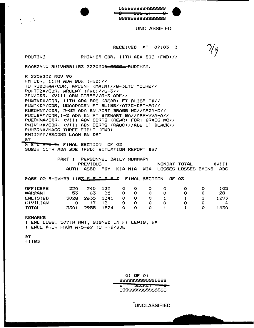 Document 11 f:/Week-29/BX000429/TACTICAL OPERATIONS CENTER LOGS - MSG FILE LOGS 23 NOV 90/11th ada bde situation report 87:08169613342730