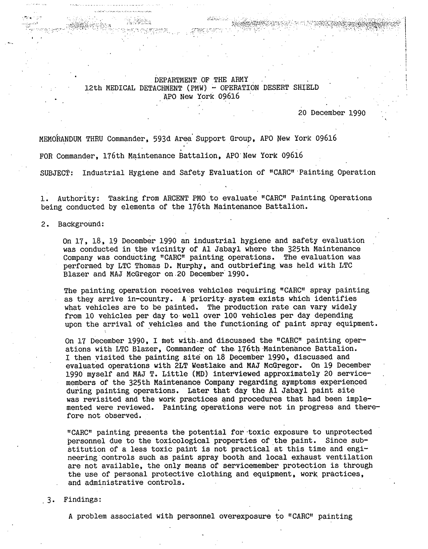 Subject = INDUSTRIAL HYGIENE AND SAFETY EVALUATION OF CARC
