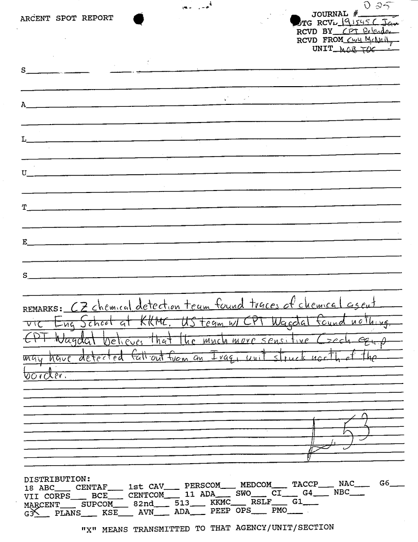 Document 1 f:/Week-30/BX000436/DAILY JOURNAL ARCENT 24 JAN 91/arcent spot report:08239614355322