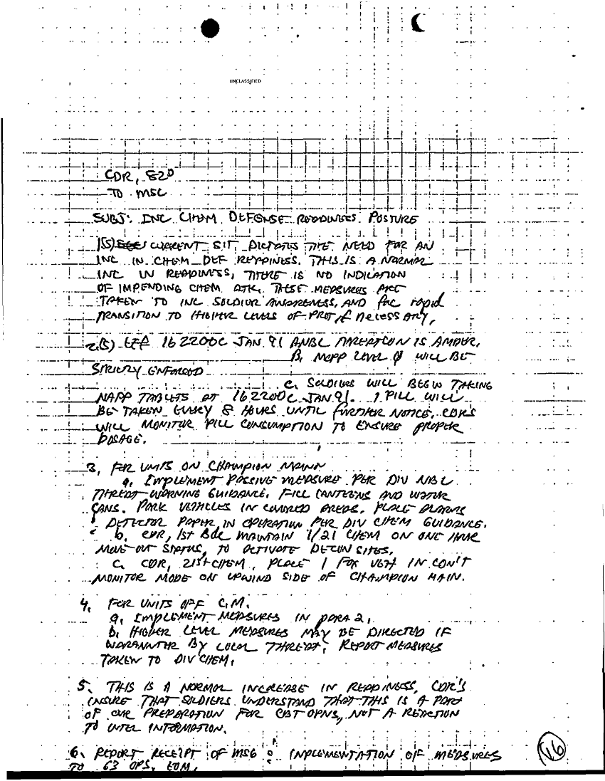 Document 1 f:/Week-22/BX001501/DUTY LOG G3 OPS 17-18 Jan 91/chem defense procedures posture:08239614362839
