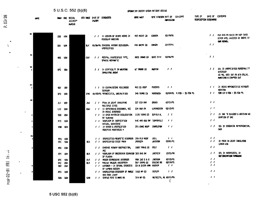 Document 38 f:/Week-31/BX000460/MEDSTAT-SITREPS - FEBRUARY - 2/ods patient status report 22feb91:09139616121511