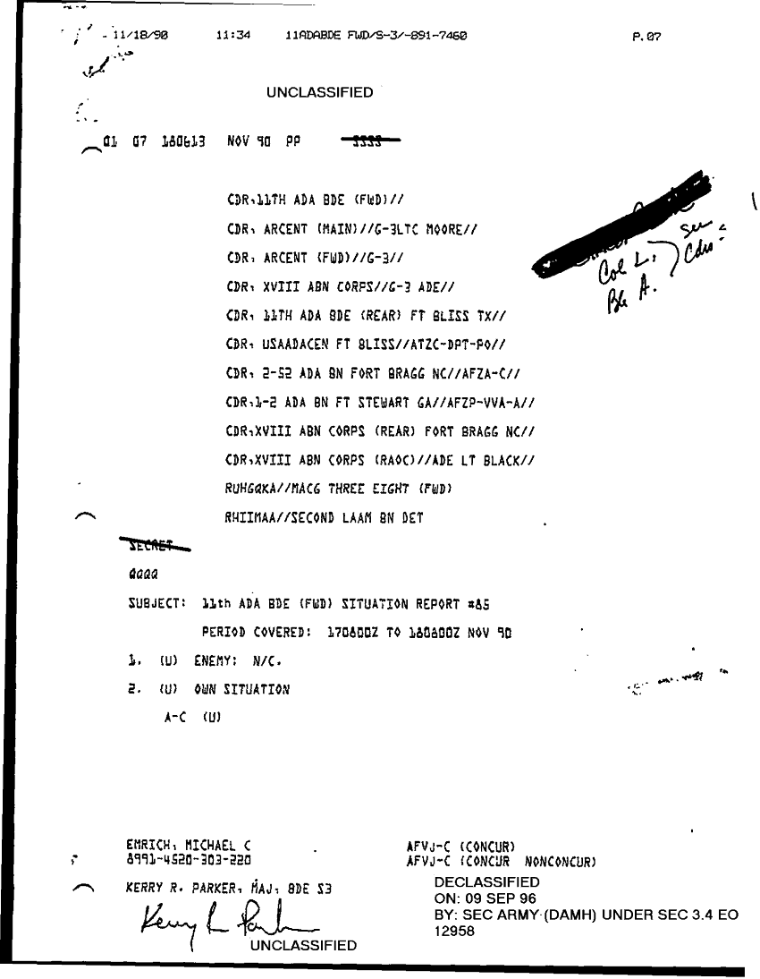 Document 7 f:/Week-32/BX000499/COMMAND REPORTS SITREPS 11TH ADA BDE 6 OCT 90-23 NOV 90/sitrep 11th ada no 85 17 to 18 nov 90:09139616152695