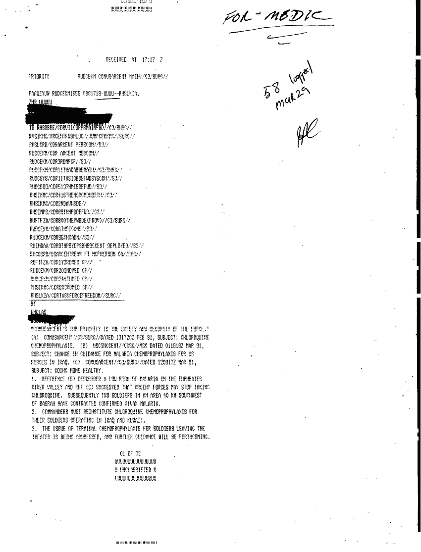 Document 2 f:/Week-33/BX000497/TACTICAL OPERATIONS CENTER LOGS TF FREEDOM 29-31 MARCH 1991/change in guidance for malaria:09139616124222