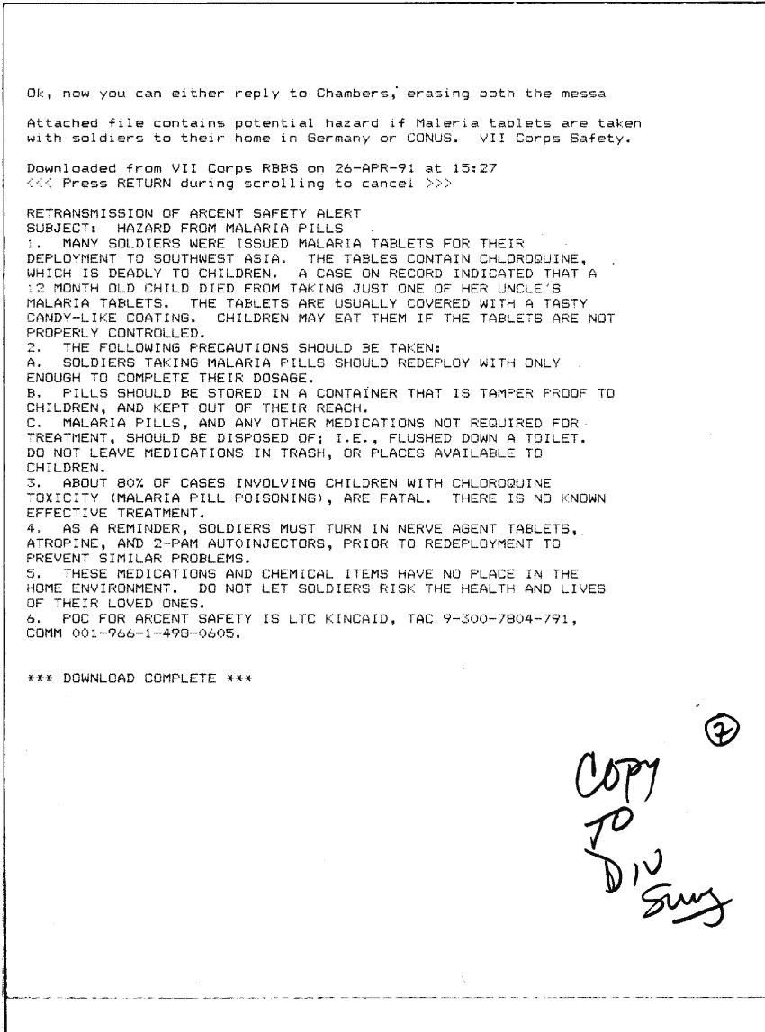 Document 1 f:/Week-28/BX001339/DSJ - TOC LOGS 3D AD MAIN CP - 26-27 APR 91/hazard from malaria pills:09139616141164