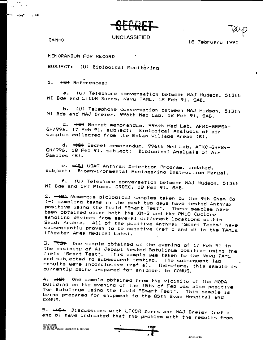 Document 2 f:/Week-29/BX000420/HISTORIANS BACKGROUND MATERIAL FILES - G3 NBC MIS 1 OF 4/biological monitoring 18 feb 91:09139616121310