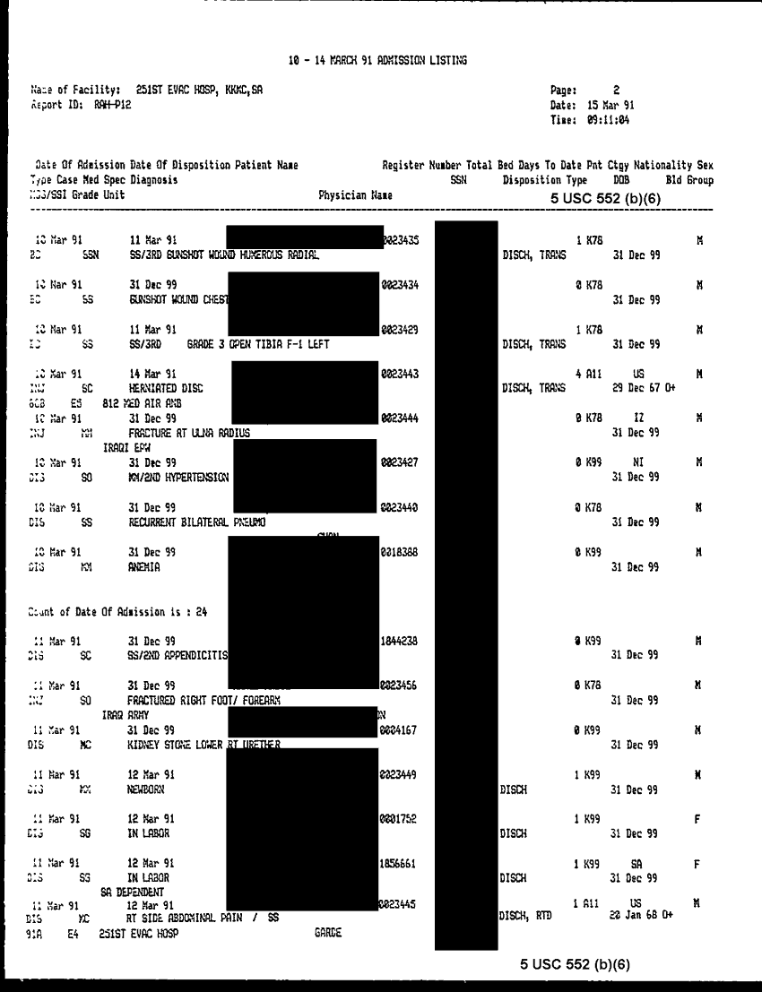 Document 11 f:/Week-32/BX000483/MEDSTAT - SITREPS APR 91 -3/patient admission listing 15 mar 91:0906961405383