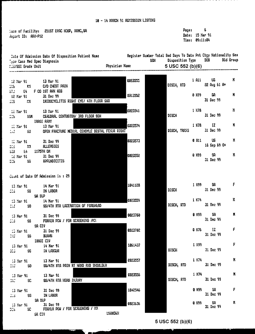 Document 11 f:/Week-32/BX000483/MEDSTAT - SITREPS APR 91 -3/patient admission listing 15 mar 91:0906961405383
