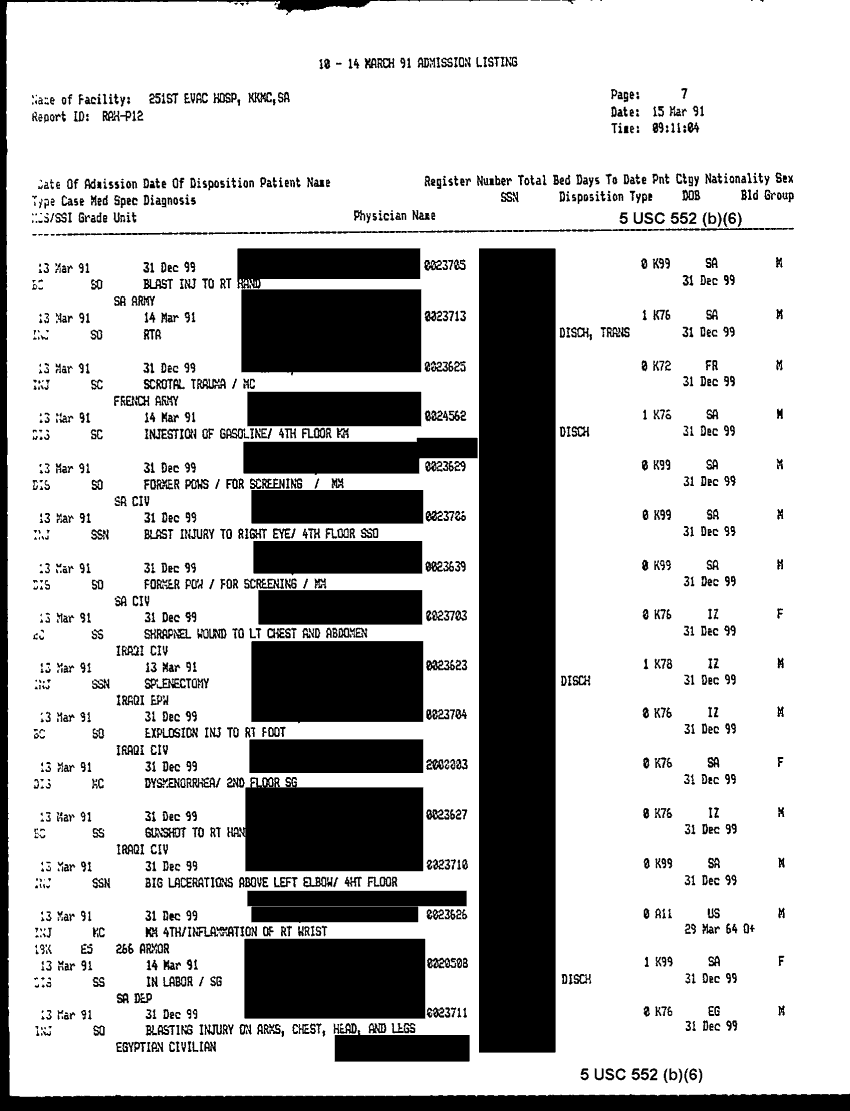 Document 11 f:/Week-32/BX000483/MEDSTAT - SITREPS APR 91 -3/patient admission listing 15 mar 91:0906961405383