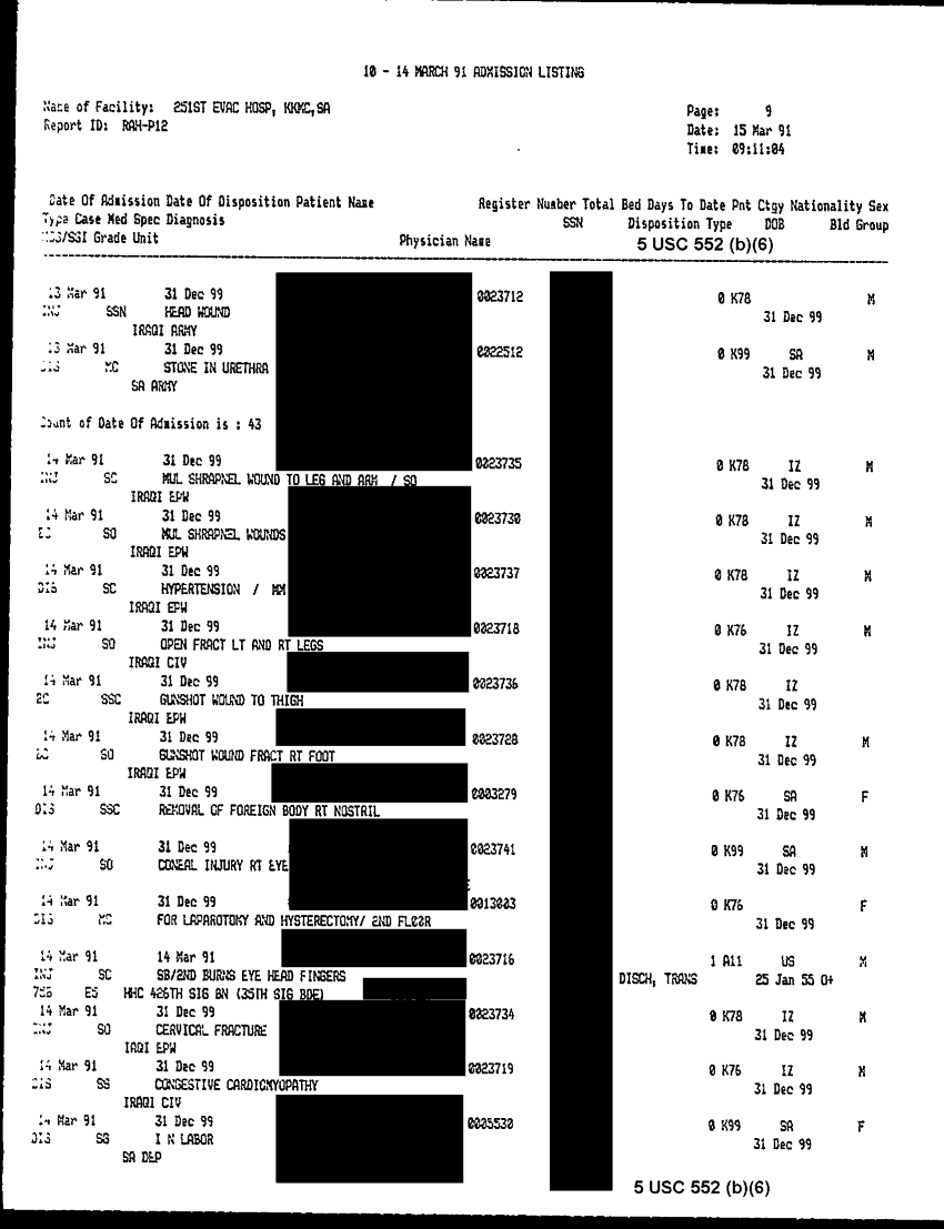 Document 11 f:/Week-32/BX000483/MEDSTAT - SITREPS APR 91 -3/patient admission listing 15 mar 91:0906961405383