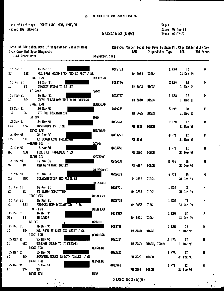 Document 28 f:/Week-32/BX000483/MEDSTAT - SITREPS APR 91 -3/patient adimission listing 15 31 mar 91:09069615155346