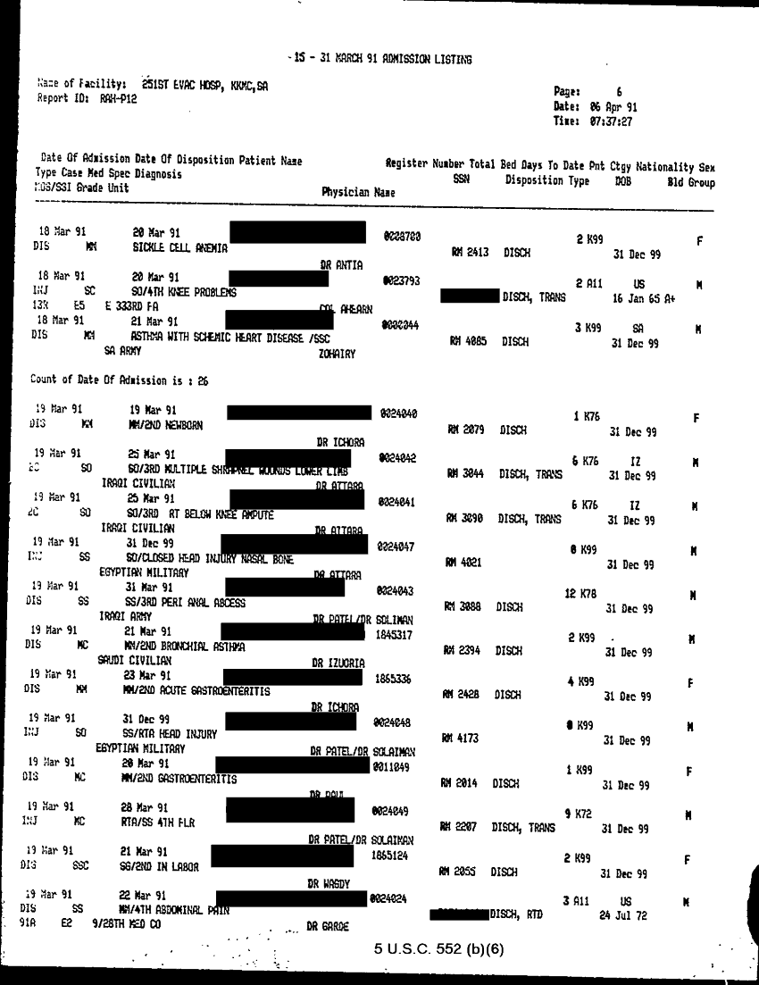 Document 28 f:/Week-32/BX000483/MEDSTAT - SITREPS APR 91 -3/patient adimission listing 15 31 mar 91:09069615155346