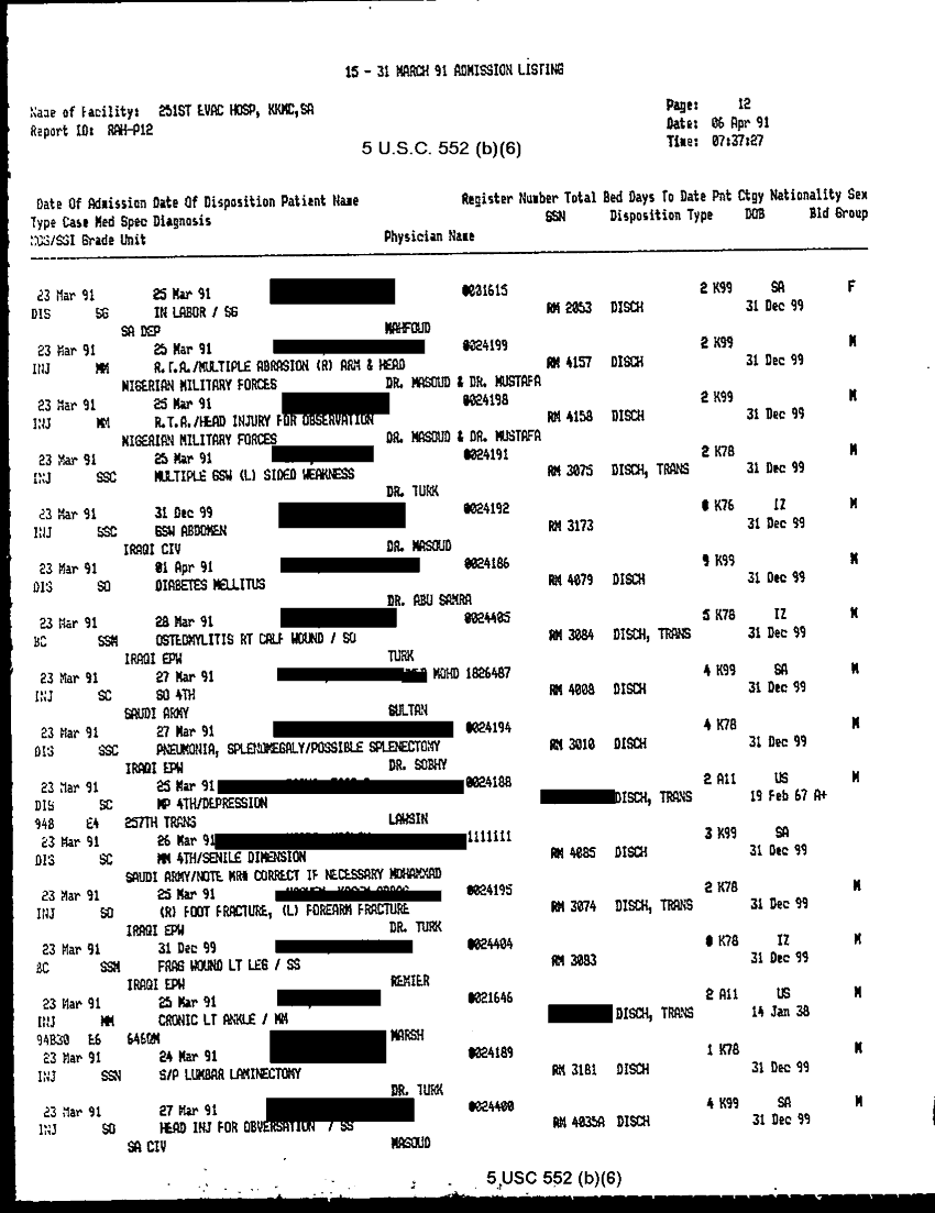 Document 28 f:/Week-32/BX000483/MEDSTAT - SITREPS APR 91 -3/patient adimission listing 15 31 mar 91:09069615155346