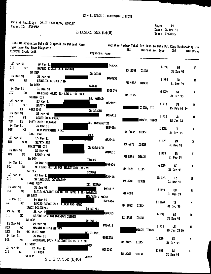 Document 28 f:/Week-32/BX000483/MEDSTAT - SITREPS APR 91 -3/patient adimission listing 15 31 mar 91:09069615155346
