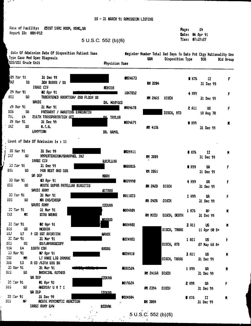 Document 28 f:/Week-32/BX000483/MEDSTAT - SITREPS APR 91 -3/patient adimission listing 15 31 mar 91:09069615155346