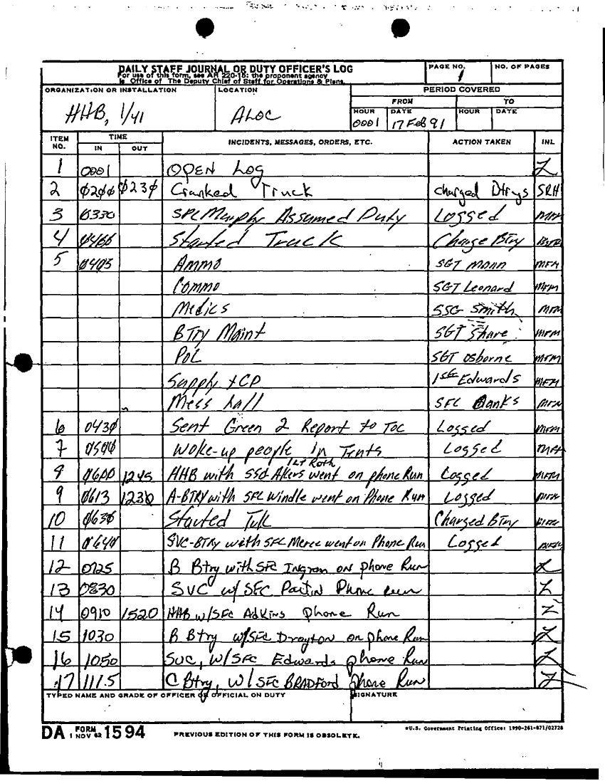 Document 21 f:/Week-22/BX001431/DAILY STAFF JOURNALS - 24TH INF - JAN-FEB 91/daily staff journal hhb 1 41 a loc:09069614062522