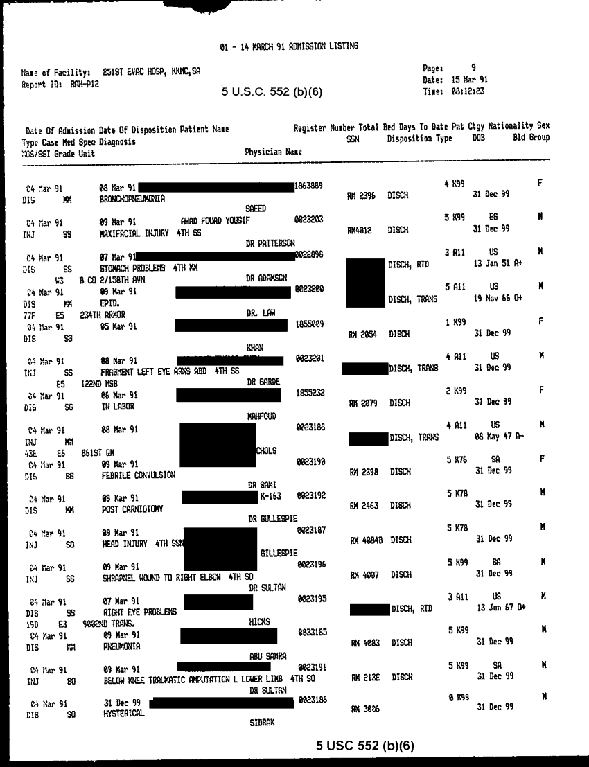 Document 30 f:/Week-32/BX000483/MEDSTAT - SITREPS APR 91 -3/patient admission listing 15 mar 91:092096155910117