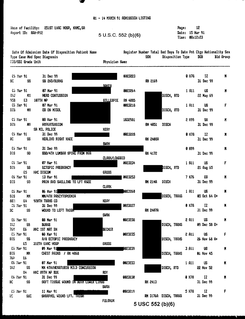 Document 30 f:/Week-32/BX000483/MEDSTAT - SITREPS APR 91 -3/patient admission listing 15 mar 91:092096155910117