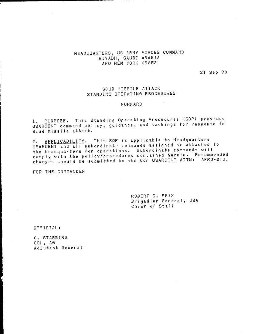 Subject = SCUD MISSILE ATTACK STANDING OPERATING PROCEDURE