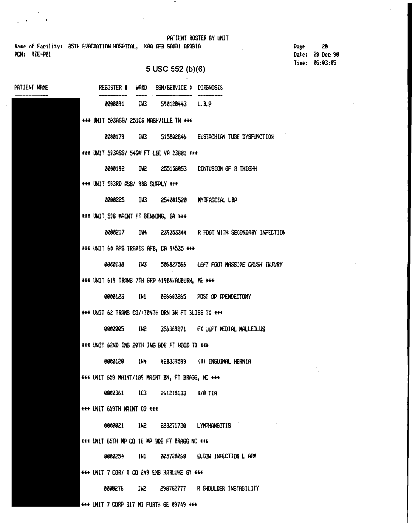 Document 30 f:/Week-32/BX000482/MEDSTAT - SITREPS DEC 90 2 OF 6/patient roster by unit 85th evac hospital 20 d:10119615412450