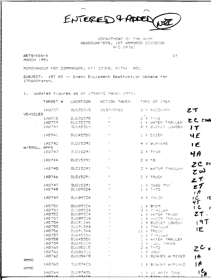 Subject = 1ST AD ENEMY EQUIPMENT DESTRUCTION UPDATE FOR 17