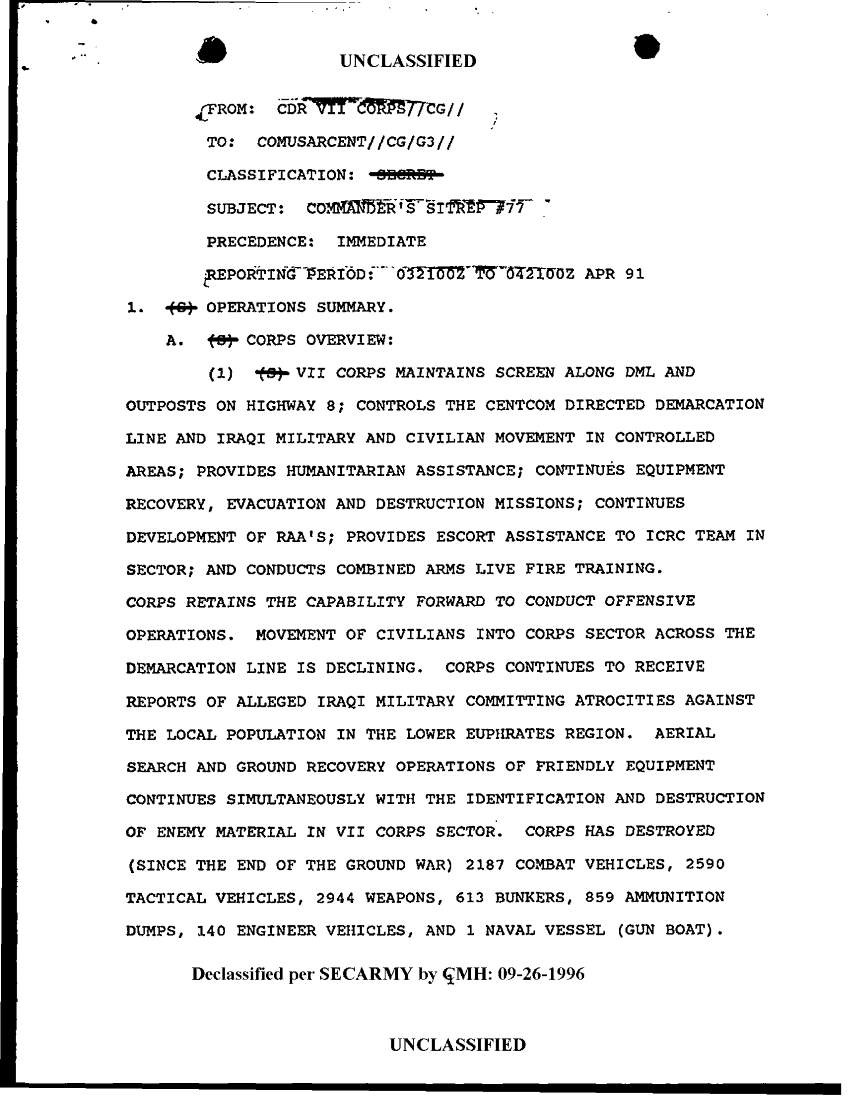 Document 12 f:/Week-24/BX000249/VII CORPS CMDRS SITREP 22 MAR THRU 6 MAY 91/commanders sitrep 77:10189613572737