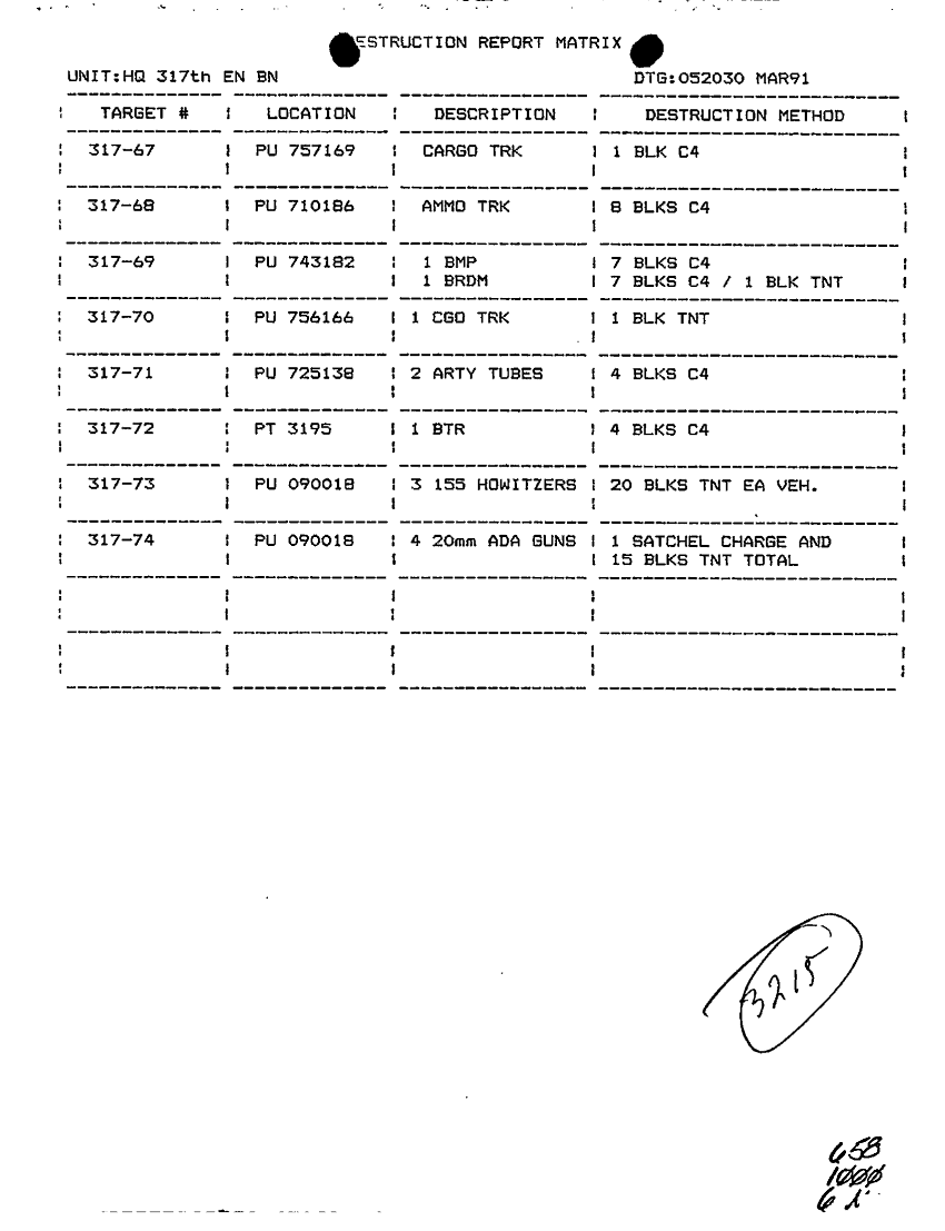 Document 1 f:/Week-24/BX000211/TASK FORCE DEMO LOG 2-14 MAR 91/destruction report matrix:10189613580673