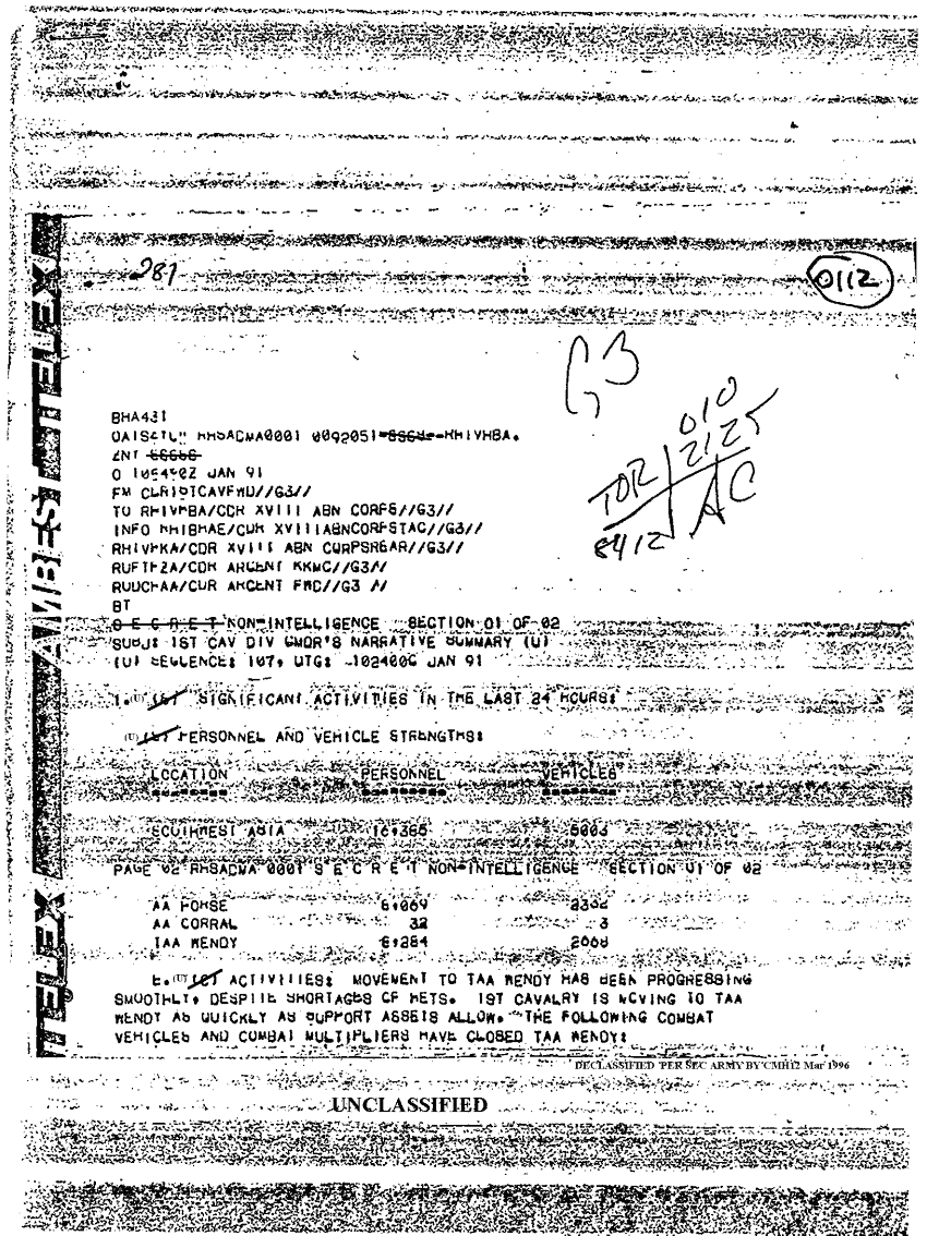 Document 21 f:/Week-08/BX000015/DUTY LOG 1 CAV DIV SITREPS G3 JAN 91/1st cav div cmdrs narrative summary:10019616503926