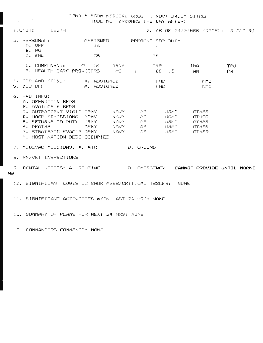 Document 6 f:/Week-34/BX005151/MED GP -PROV- DAILY SITREPS OCT 91/22nd supcom medical group daily sitrep 5 oct 91:11049609132158