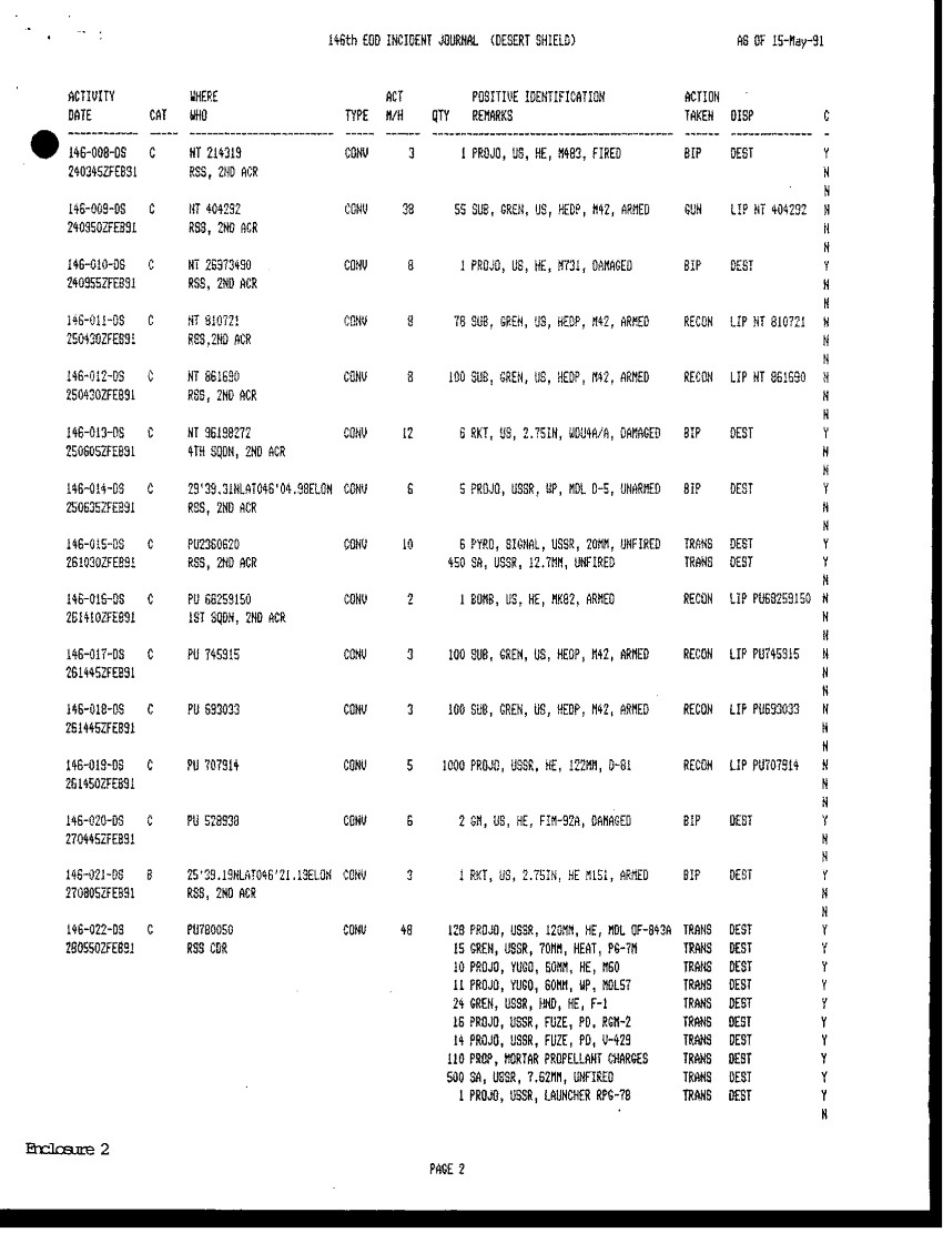 Document 27 f:/Week-42/BX005554/ARMY EOD IN DESERT STORM VOL 5 512 EOD CONTROL TEAM EODCT/reply to questionaire for all detachments:11049609124410
